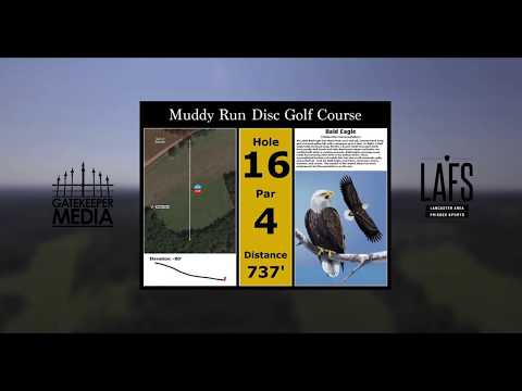 Explore hole 16's challenging layout & terrain features at Muddy Run Disc Golf Course in scenic Holtwood, Pennsylvania.